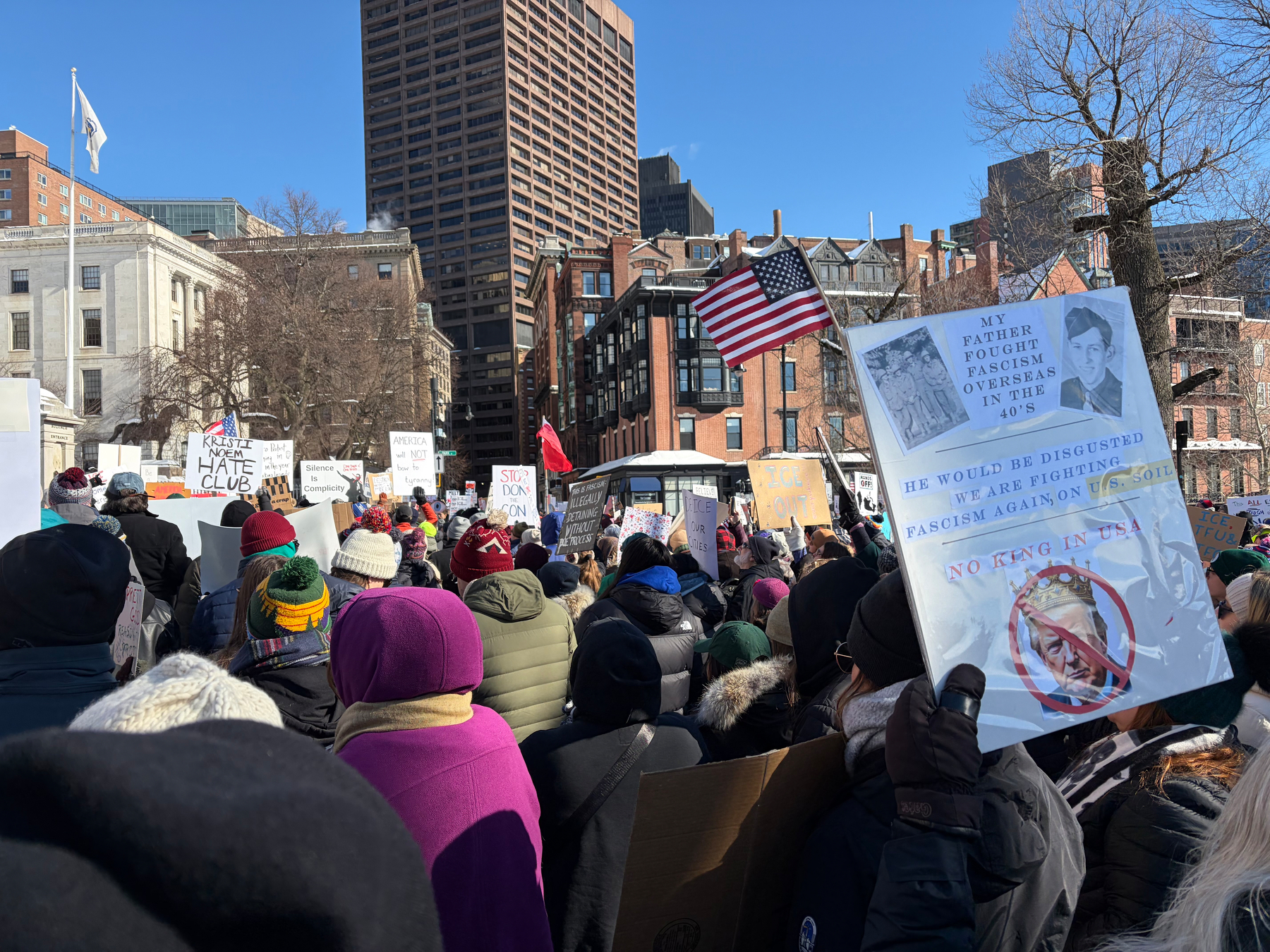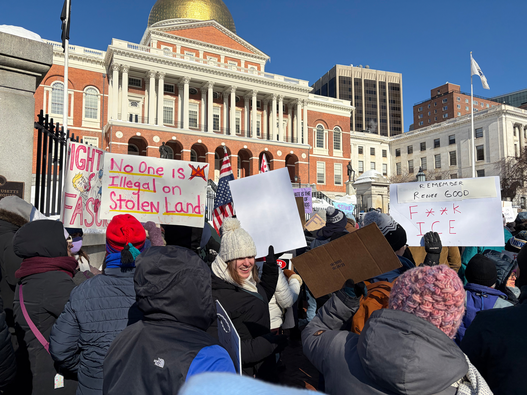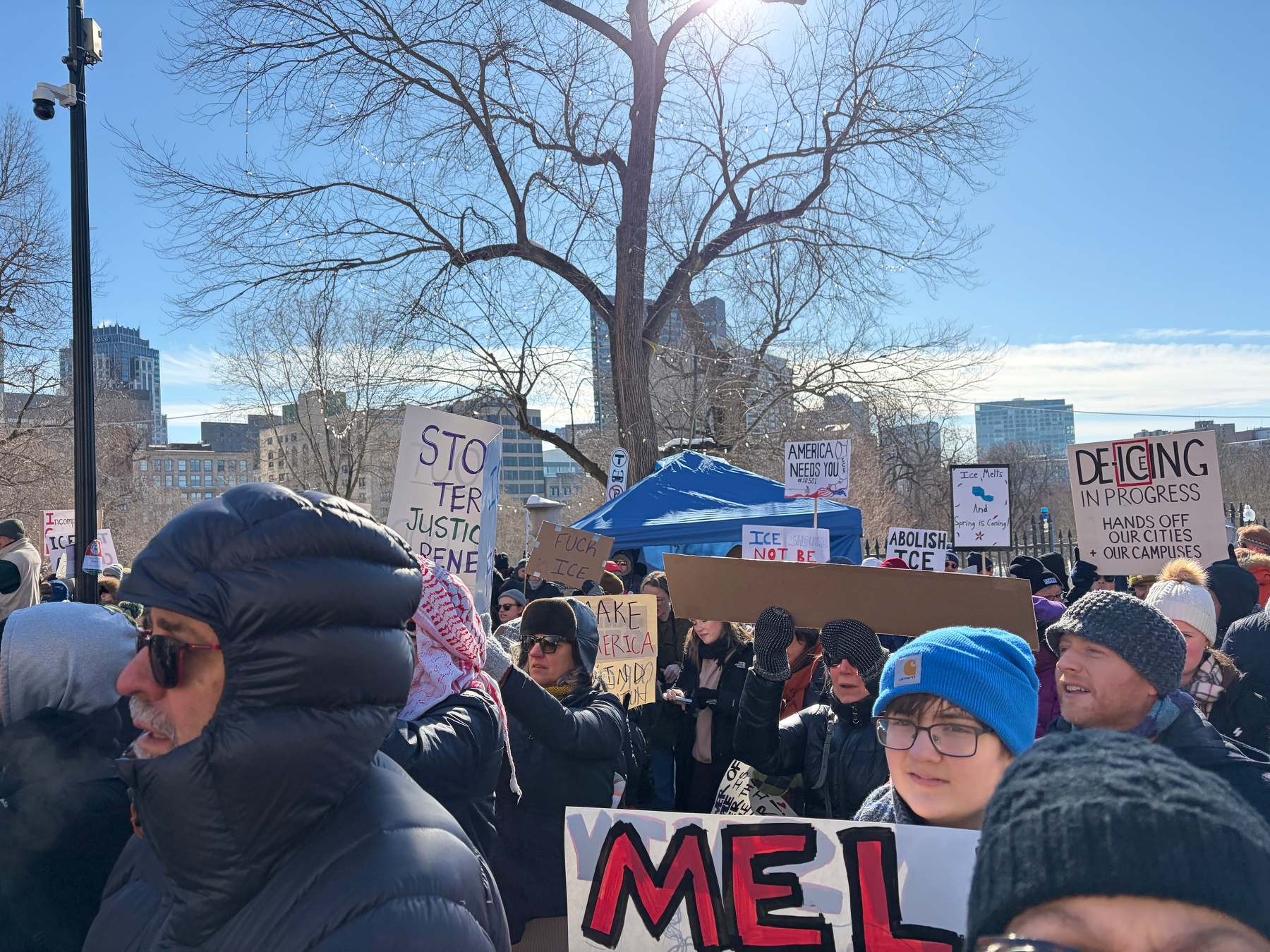 Good crowd protesting against ICE in Boston, where it is 15°F (-9°C).